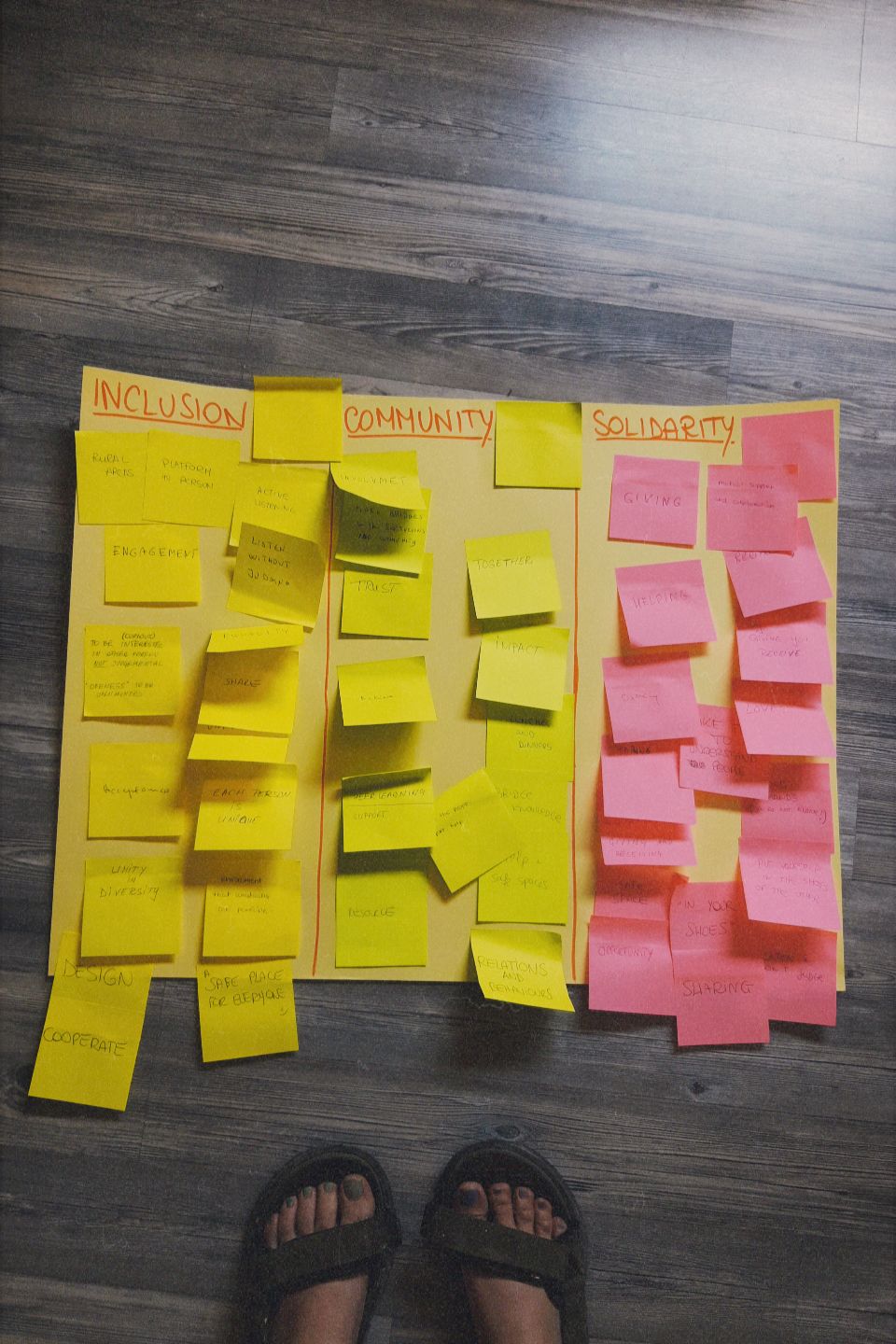 Sesiones de trabajo colaborativo para diagnosticar necesidades locales y co-crear soluciones creativas.